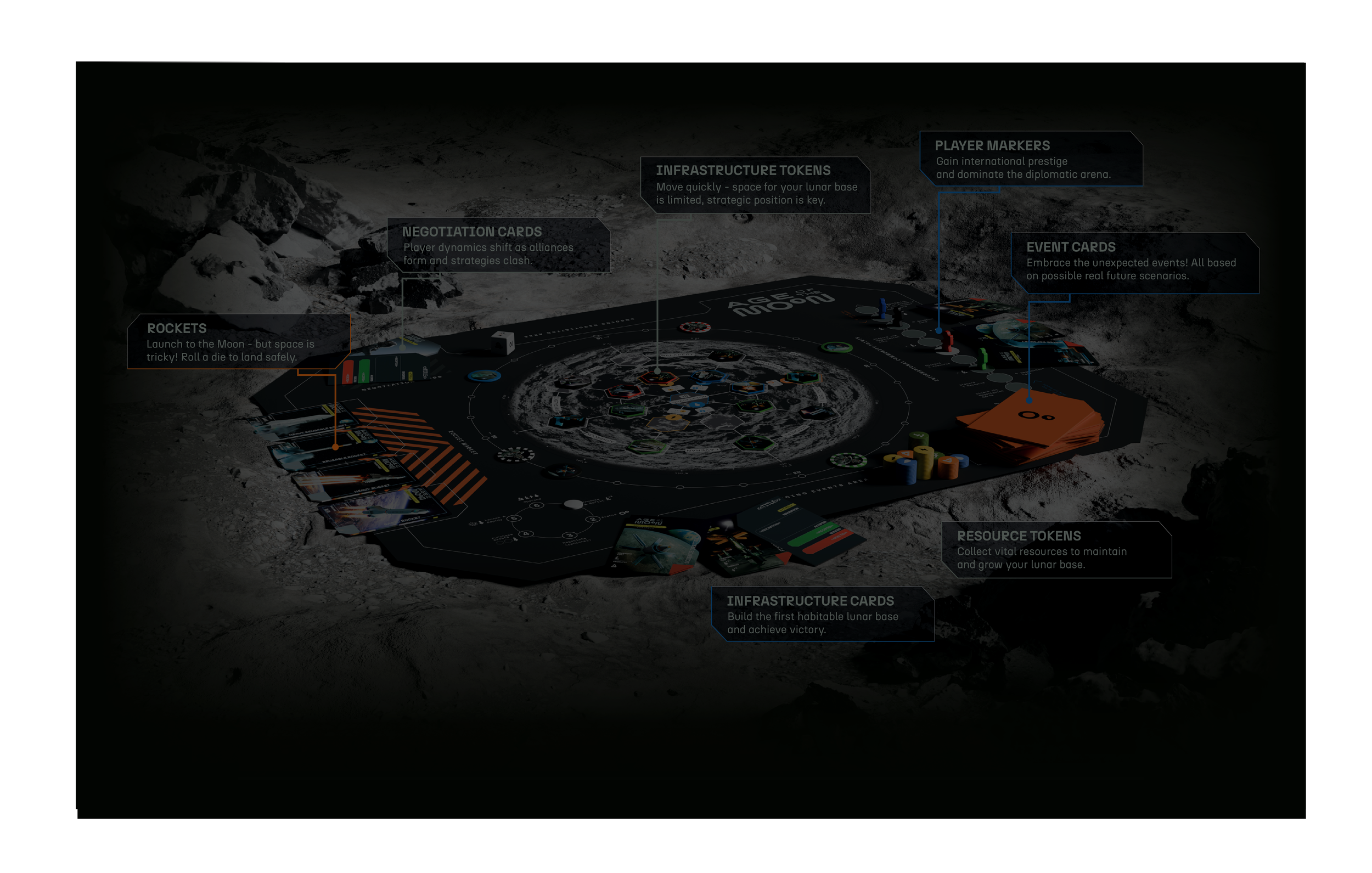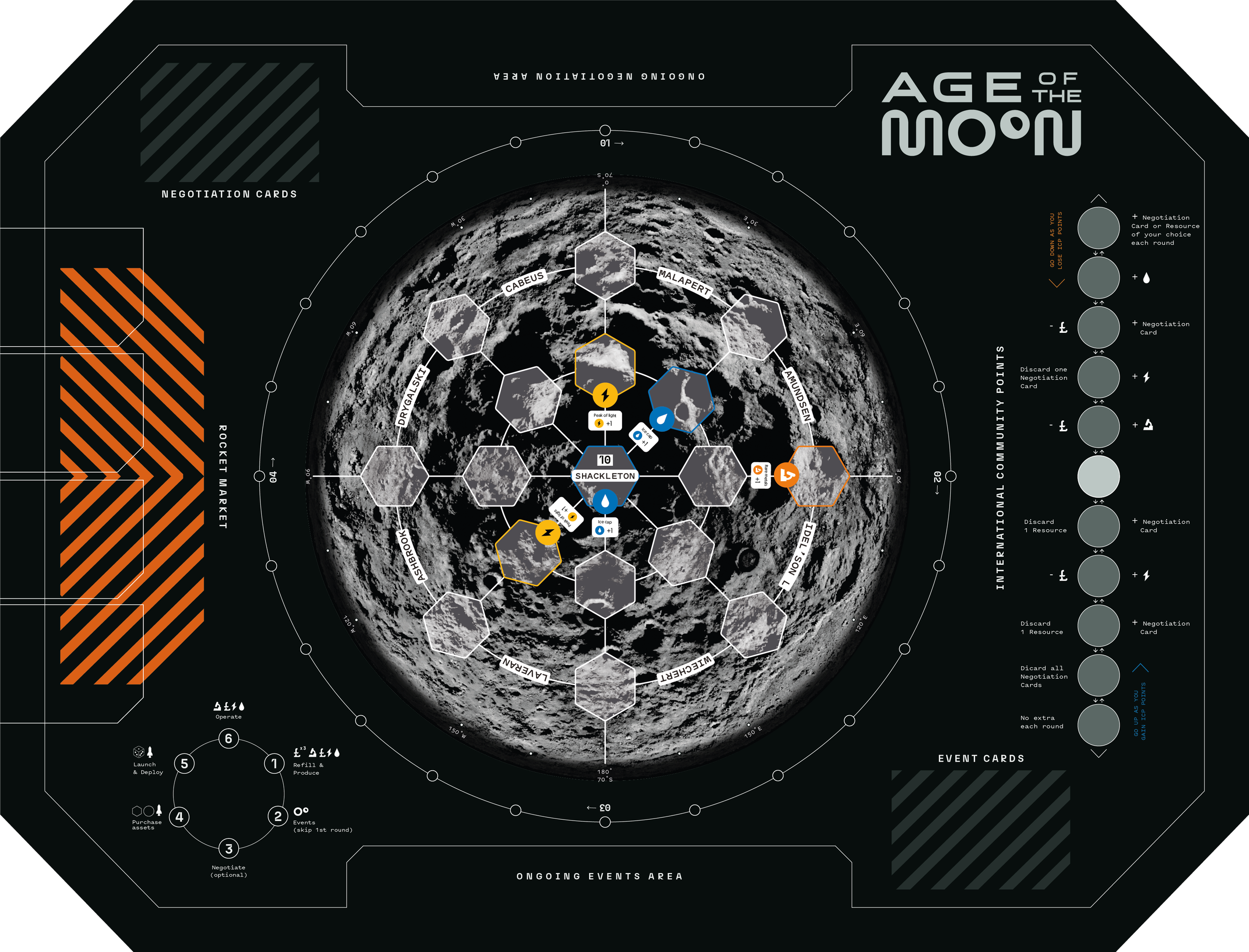 Load assets onto rockets and send them into orbit (safe) or attempt a landing on the Moon (roll the die to see if it succeeds).
